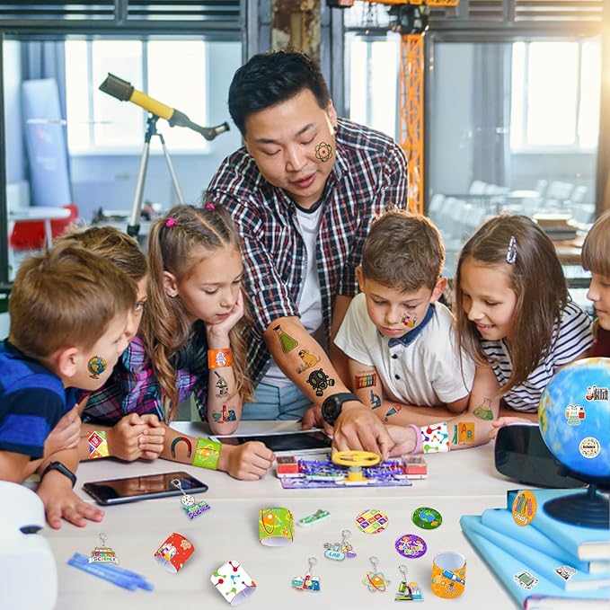- 【Science Party Favors】: Science birthday party favors contains 12 science slap Bracelets,12 science button pins, 12 science key chains, 50 science Stickers and 12 sheet science temporary tattoos, designed to be science theme, with a variety of different patterns including test tubes, beakers and microscopes, magnets, chemical reactions, caution signs, elements, compounds, DNA +,etc.