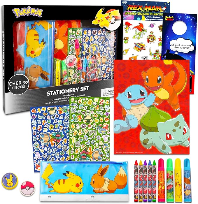- This Pokemon stationery set comes with 4 markers, 2 erasers, 1 pencil pouch, 1 sketch pad (10 sheets), 100+ Pokemon stickers, 1 pencil, and other coloring supplies.
