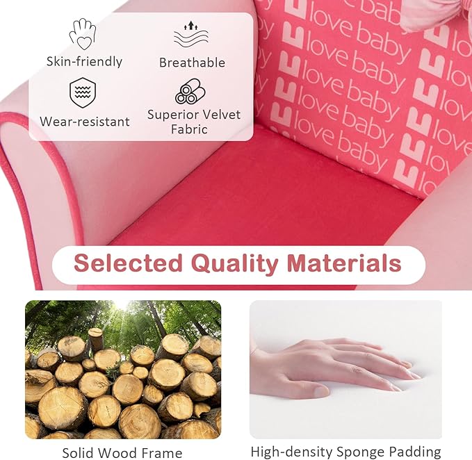 - Soft Touch & Cute Bow Decoration: This kids sofa is covered with soft, skin-friendly, breathable, cozy and warm velvet surface to give your toddler a good touch. What's more, the cute bow on the sofa will immediately attract your little princess's attention and make her fall in love with this exclusive pink sofa.