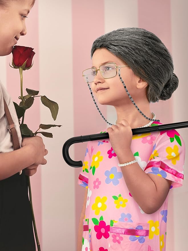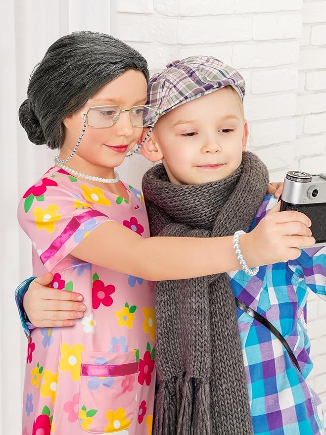 - What's Included - Our old lady costume for kids set includes 1pcs old lady dress, 1pcs black white bun wig, 1 set of old lady glasses with 1pcs chain, 1pcs pearl necklace, 1pcs pearl bracelet, 1pcs wig cap, and 1pcs kids cane prop. Great 100th day of school costume for girls cosplay.