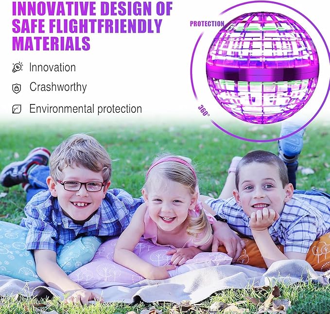 - Safe Design And Durability: The flying orb toys conducted rigorous tests. Materials is very soft, the protective shell of spherical design is adopted to ensure the safety, the durability and impact resistance of the flying ball toy.This flying ball drone toy is made of high-grade ABS material, which is lightweight and flexibl. The propellers are safely concealed within the ball drone. The enclosed propellers cause no worry that children will be hurt by their blades.