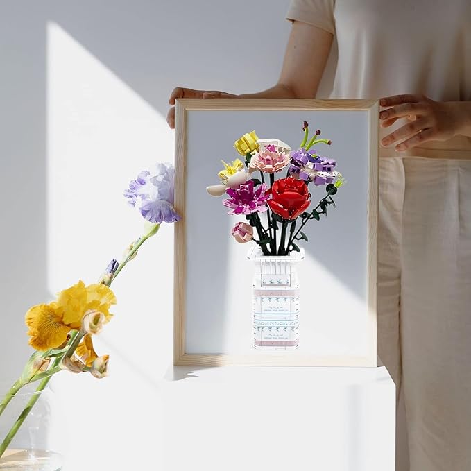 Adults Flowers Bouquet Building Set for Women, 10 Artificial Flowers, with Blocks Vase (730 Pcs)