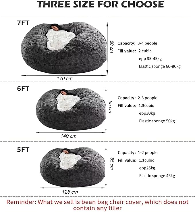 - ❤️ [About Size] Three Size varies from 5FT to 7FT which is suitable for kids and adults use. 5FT=120*50CM(Capacity:1-2 people ), 6FT=140*65cm (Capacity: 2-3 people ), 7FT=170*80cm (Capacity: 3-4 people). (Only contains a bean bag cover)