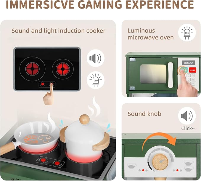 - 【Versatile Kids Kitchen Playset】The wooden play kitchen set has over 9 functions, featuring coffee machine, microwave, kitchen sink, oven, dishwasher, cupboard and induction cooker, along with realistic lights and sound effects, and there are separate buttons to control on and off. The special garbage sorting feature not only teaches children about environmental responsibility but also enhances parent-child relationships.