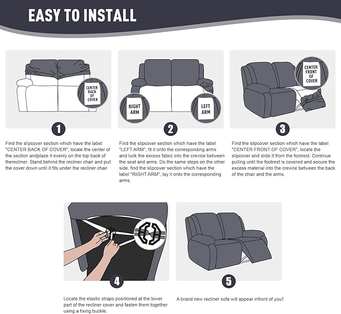 - EASY TO INSTALL: Our loveseat recliner covers have exquisite workmanship, a total of 6 pieces set, including 2 seat covers, 2 armrest covers, 2 cushion covers. The recliner covers also equips with bottom elastic and reinforcement straps, you can use buckle to make the cover in place without moving