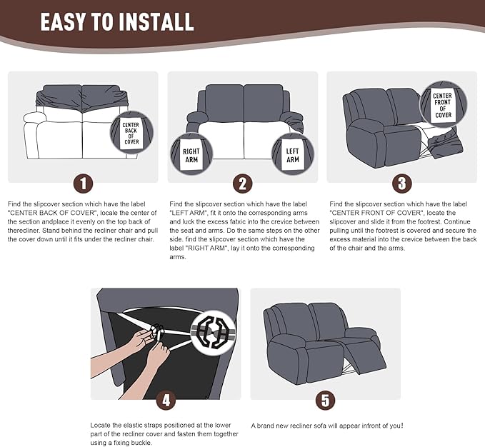 • EASY TO INSTALL: Our loveseat recliner covers have exquisite workmanship, a total of 6 pieces set, including 2 seat covers, 2 armrest covers, 2 cushion covers. The recliner covers also equips with bottom elastic and reinforcement straps, you can use buckle to make the cover in place without moving
