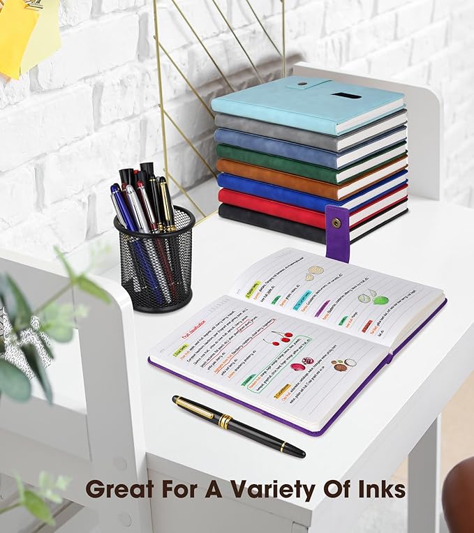 - 【PREMIUM THICK PAPER】:5.9 X 8.4 inch journal notebook with 200 pages 100 gsm lined paper, thicker 30% than normal, this purple notebook is designed to avoid feathering and the paper is ink-proof, suit for most pens, but the wettest pen inks. Archival-quality pages made from acid-free paper-resists damage from light and air, the cream paper is easy on eyes.Let your creation more freedom on the wide ruled journal to write in.