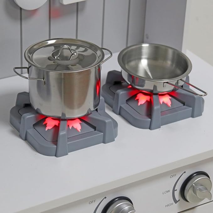 - Simulated Design - Play Kitchen with Lights and Sounds. The baby kitchen stoves feature real cooking set for kids,sounds that simulates a real one with three methods, make pretend play kitchen more lively and interesting, create an immersive play experience for children and kids.