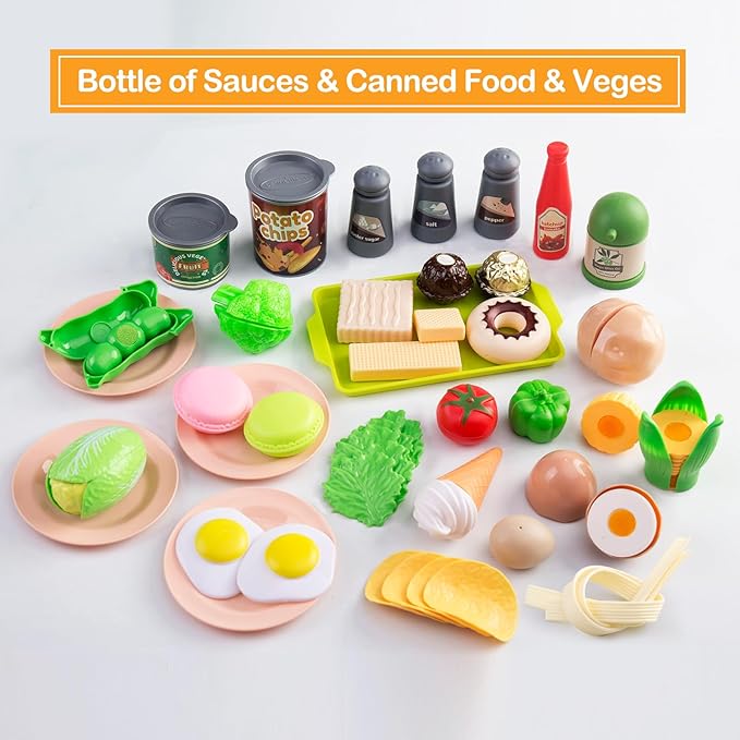- 【Simulate life scenes & Cooking experience】Each kitchen set comes with 150Pcs stylish, open design and fresh colors pretend kitchen toys, include play pots and pans sets, kettle, bowls, plates, chopsticks, toy kitchen cookware, knives set, canned pretend cuttable food & vegetables & fruit with 2pack basket, fast food set, picnic cloth, dessert and prop money, much more to provide endless hours of fun