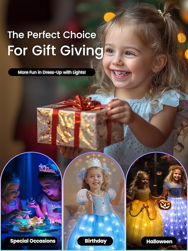 - Perfect For Any Event - Birthday party, Halloween gathering, Christmas, school events, this princess dress costume is sure to be a big hit! Watch as your kid's eyes light up with LED dress magic. Get Ready to Stun in Our LED Princess Dress Costume!