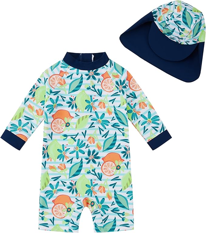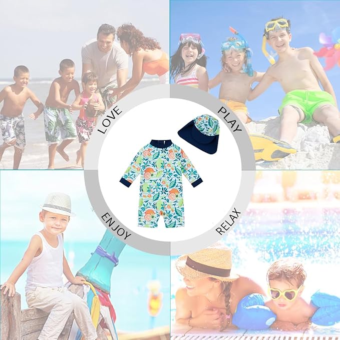- CUTE SUN HAT: Toddler rash guard that comes with a lovely hat, it covers baby's delicate face and neck. which can give baby more protection when playing at the sea, beach or under the sun