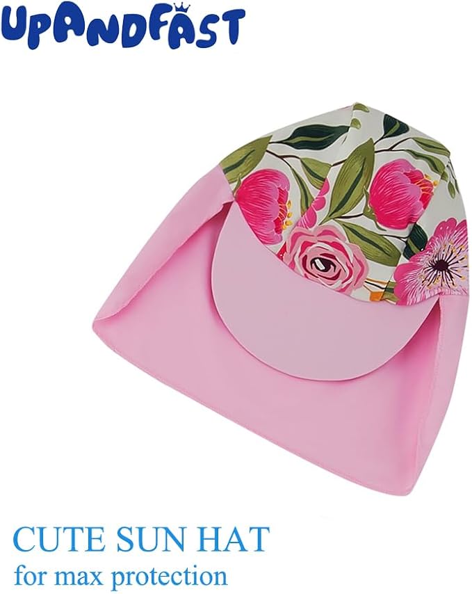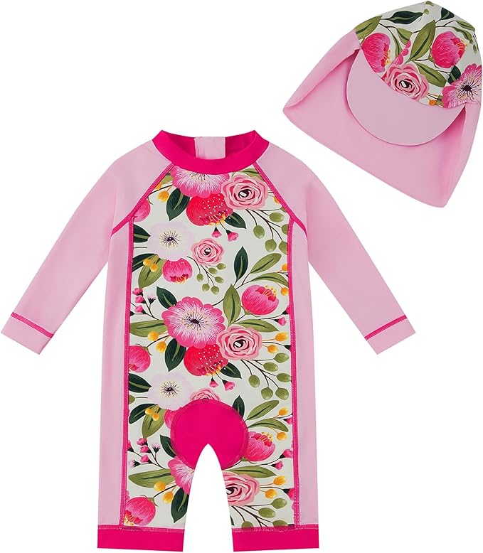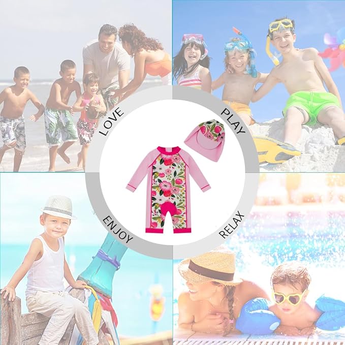 • CUTE SUN HAT: Toddler rash guard that comes with a lovely hat, it covers baby's delicate face and neck. which can give baby more protection when playing at the sea, beach or under the sun