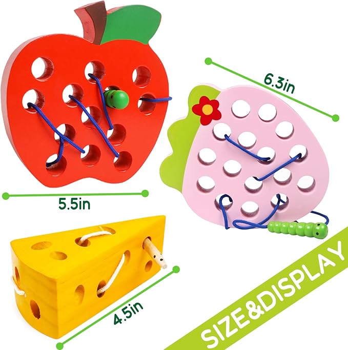 - Lacing Toys for Toddlers:Wooden lacing toys set stimulates toddlers senses and improves their fine motor skills, this montessori-inspired educational toys features an adorable apple cheese and watermelon design that encourages toddlers hands-on learning and exploration.