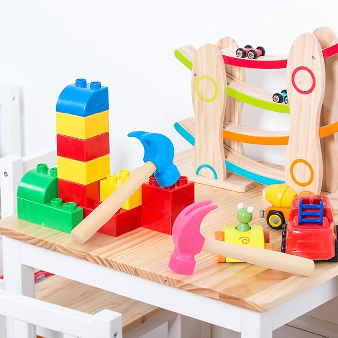 - Size: The package includes 1pcs blue wooden hammer toy and 1pcs rose red wooden hammer toy, each wooden hammer size is 6.5 x 3 inch, comact size and lightweight, suitable for kids to play and convenient to carry.