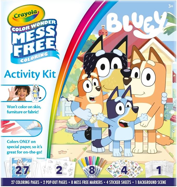 - COLOR WONDER MESS-FREE COLORING: Prepare to embark on a mess-free coloring quest with Bluey and friends! This set includes 27 Bluey Coloring Pages (8x10"), 8 Mess-Free Markers, 4 Metallic Sticker Sheets, 2 Diecut Cardstock Bluey Character Cutouts, 1 Trifold Background Scene.