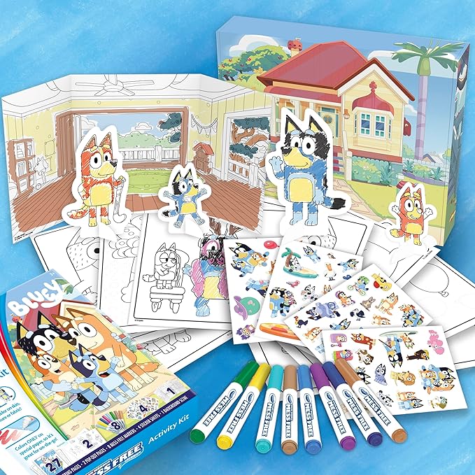• COLOR WONDER MESS-FREE COLORING: Prepare to embark on a mess-free coloring quest with Bluey and friends! This set includes 27 Bluey Coloring Pages (8x10"), 8 Mess-Free Markers, 4 Metallic Sticker Sheets, 2 Diecut Cardstock Bluey Character Cutouts, 1 Trifold Background Scene.