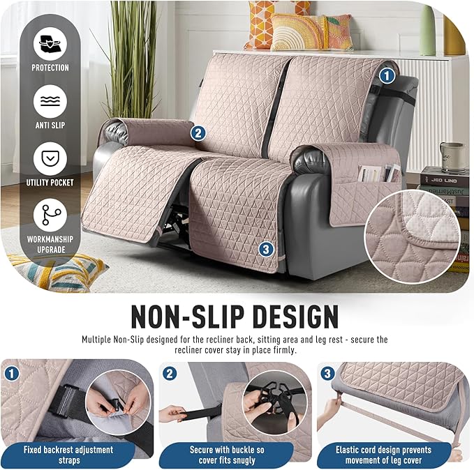 - 【Four-Tier Anti-Slip Promise】Tired of your love seat couch covers slipping all over? Discover our Fourfold Anti-Slip Innovation! 1. Backed by anti-slip silicone particles; 2. Three elastic straps for the headrest, lumbar, and footrest of the recliner - no more worries about your large recliner cover taking a stroll!