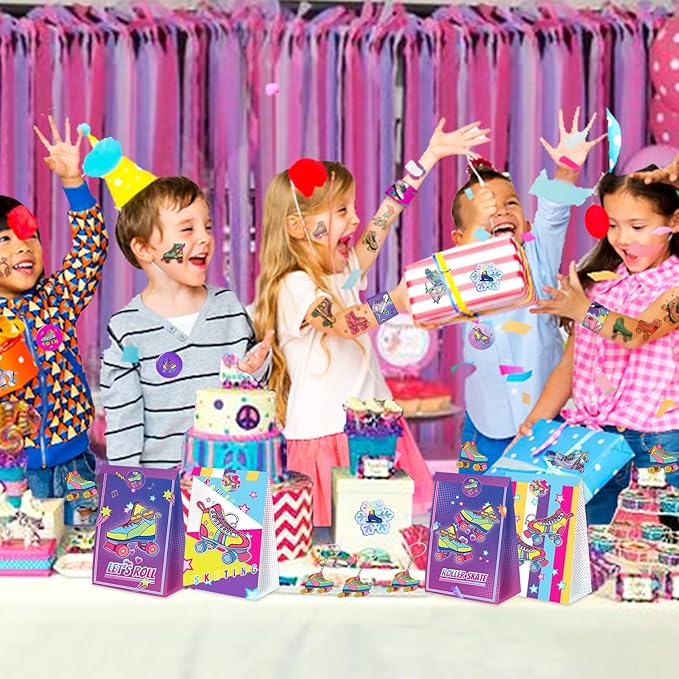 - 【Package Include】:Roller skate party favors includes 12pcs roller skate slap bracelets,50pcs roller skate stickers,12pcs roller skate paw keychains, 12pcs roller skate badges ,12 sheet of roller skate temporary tattoos (over 144 patterns), 12pcs gift bags with sealing stickers. Enough quantity to meet your party needs!