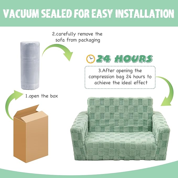 - 【No Installation Required】: The kids fold out couch comes in vacuum packing. Simply take it out and plump it up for 24 hours. Allowing 24 hours is best for the toddler chair to reach its full size.