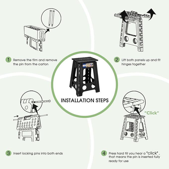 - 【Proper Use and Customer Serve】The plastic step stool must be used on a dry and flat surface.Ensure that the stool is fully open before use and that you hear the Pins fixing "Click" sound.Don't stand on the edget of the stool with one foot or tiptoe.Don't move stools while in use.Our warranty is 3 months with proper use.Customer service Available 24/7.If the pins lost unexpectedly, please do not hesitate to contact us for a replacement.