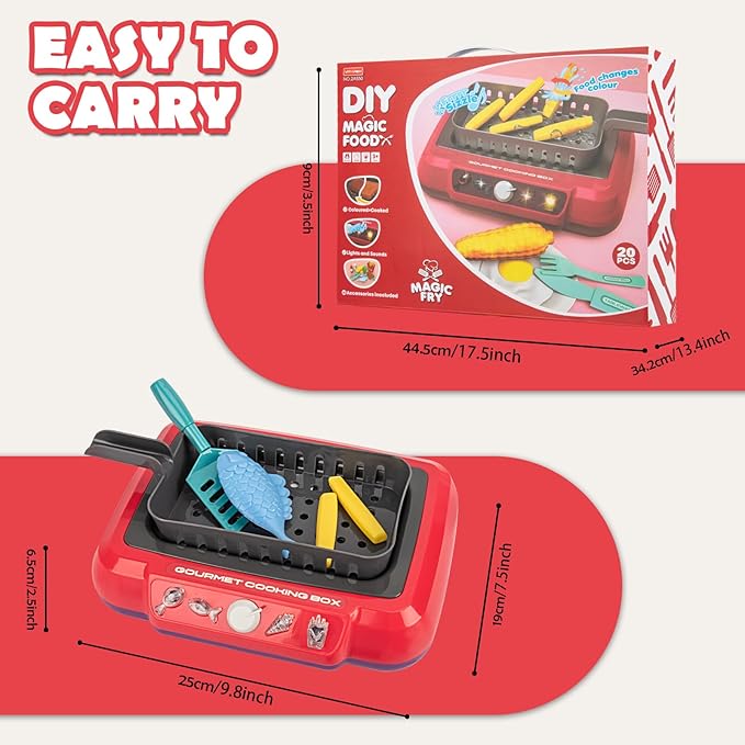 - Realistic Gourmet Cooking Box Toy: This color changing cooking toy includes one realistic fryer and 19PCS play kitchen accessories. 4A Batteries needed which are not included. It encourages interactive role play and improve little ones’ social and emotional skills, through giving children a more realistic cooking experience.