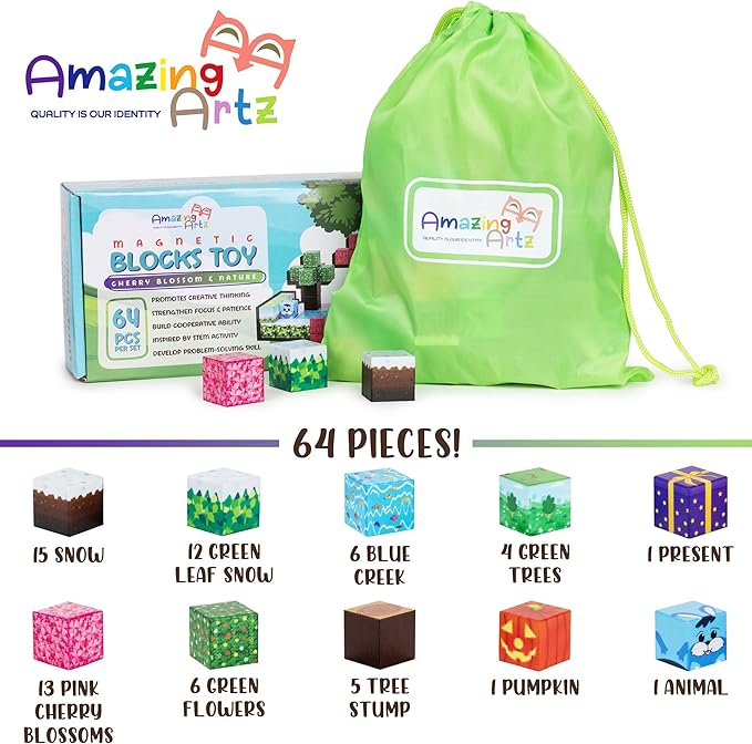 • [Take the fun on the go] This minecraft magnetic blocks set comes with a handy neon green drawstring bag, making it perfect for storage and travel. Whether you’re heading to a playdate, vacation, or grandma’s house, your child can enjoy endless building adventures wherever they are.