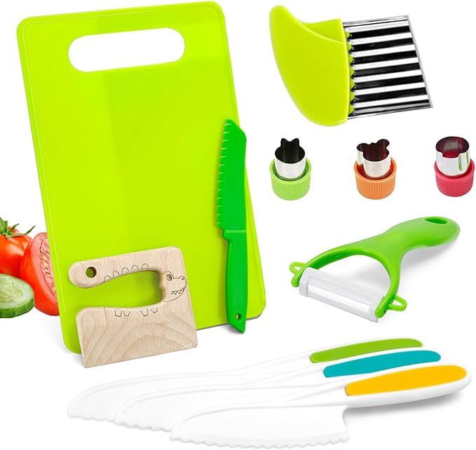 11 PCS Montessori Kitchen Tools and Safe Cooking Sets for Toddlers – Explore Real Cooking with Toddler-Friendly Plastic Knives, Crinkle Cutter, and Cutting Board