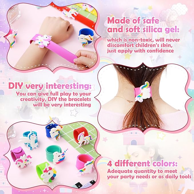 - Quality Material: our slap bracelets are crafted from silicon material, making them resilient, long lasting, and safe for your skin; Combined with the interior metal core with silicone cover, these bracelets are virtually break and deformation resistant; Ideal for unicorn theme parties or daily wear, our silicon slap bracelets combine comfort with durability