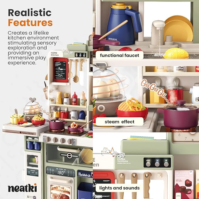- Steaming Feature – This toddler kitchen playset includes a steaming feature that mimics real cooking action, adding an extra layer of authenticity to playtime. It inspires imaginative cooking scenarios and sparks creativity, making it a perfect addition to any kids play kitchen set.