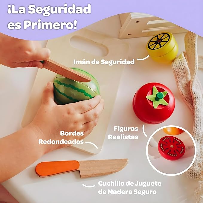 - [Meet Miniminds] your go-to for innovative educational play! Our Magnetic Play Food and Cutting Food Toys for Toddlers, part of our wooden toys collection, make learning fun, safe, and top-quality with the kids kitchen playset.