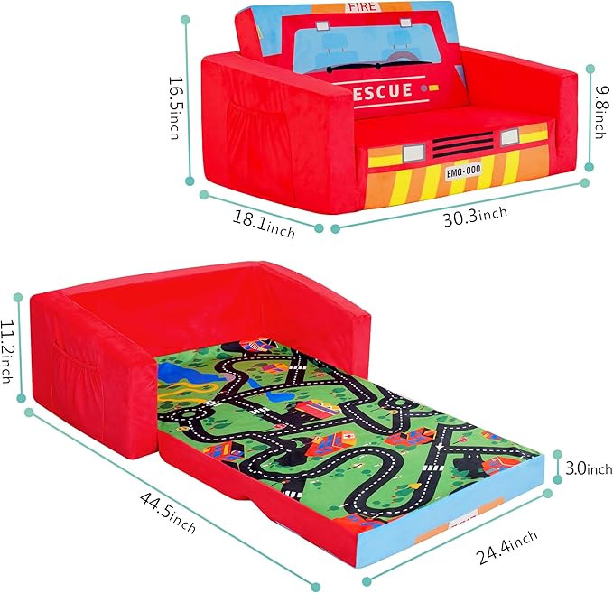 MallBest Kids Sofas, Extra Wide Toddler Couch Bed - 2 in 1 Baby Convertible Foam Chair to Lounger,Toddler Couch for Boys and Girls,Red/Fire Truck