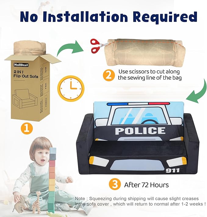 MallBest Kids Sofas, Extra Wide Toddler Couch Bed - 2 in 1 Baby Convertible Foam Chair to Lounger,Toddler Couch for Boys and Girls,Black/Police Car