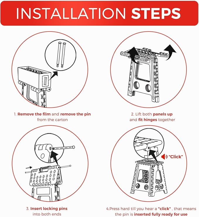 - Proper Use and Customer Serve: The collapsible step stool must be used on a dry and flat surface. Ensure that the stool is fully open before use and that you hear the Pins fixing "Click" sound. Don't stand on the edget of the stool with one foot or tiptoe. Don't move stool while in use. Our warranty is 3 months with proper use. Customer service Available 24/7. If the pins lost unexpectedly, please do not hesitate to contact us for a replacement.