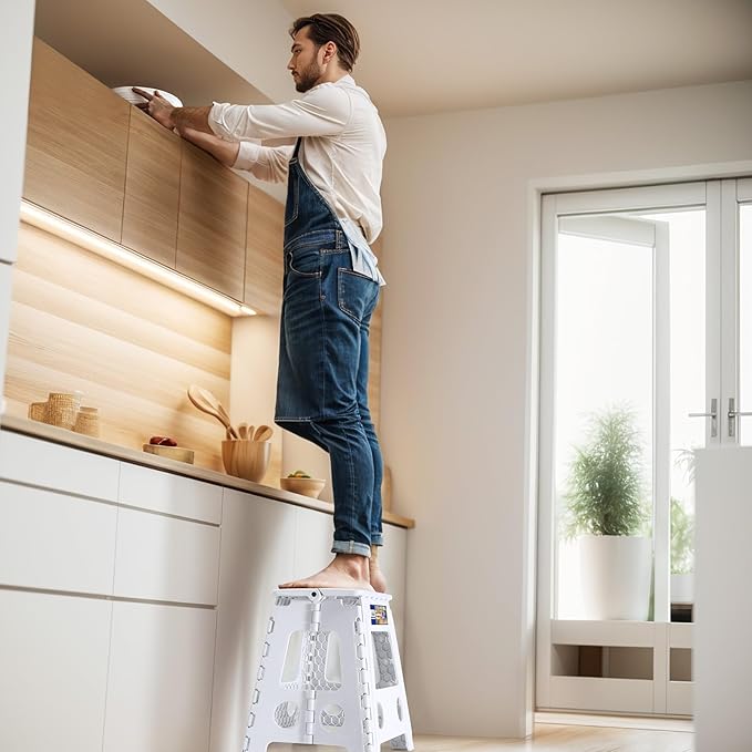 - Safety-Focused Design: Our lightweight folding step stool equipped with a non-slip surface, movable handle and the bottom corners are upgraded to black non-slip dot textured rubber straps to prevent slips and finger traps, improving a secure user experience.