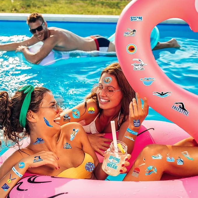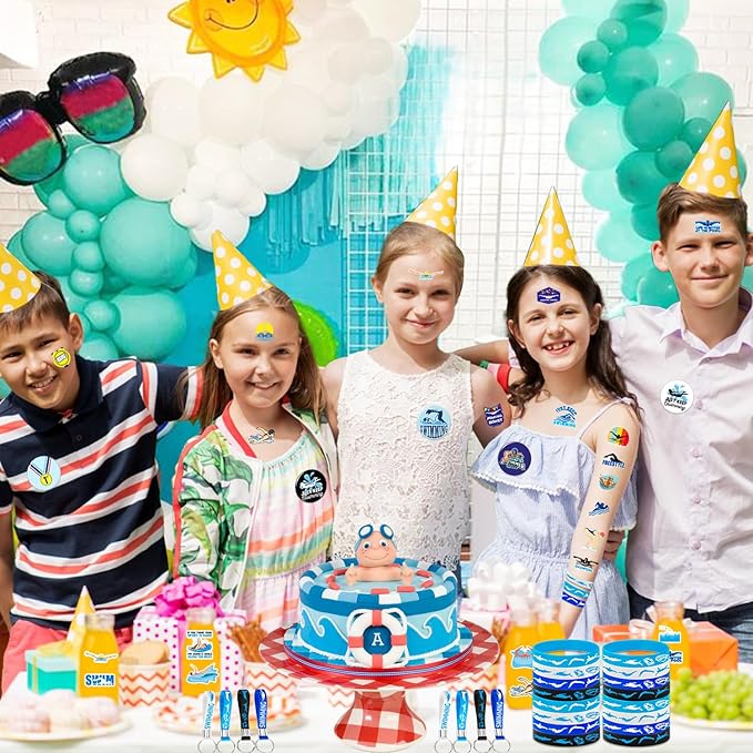 - Package Include: The swimming party favors contain 12 sheet swimming temporary tattoos (72 patterns), 12 pcs swimming silicone bracelets, 12 pcs swimming keychains, 12 pcs swimming badges, 50 pcs swimming stickers, Enough quantity to meet your swimming party needs