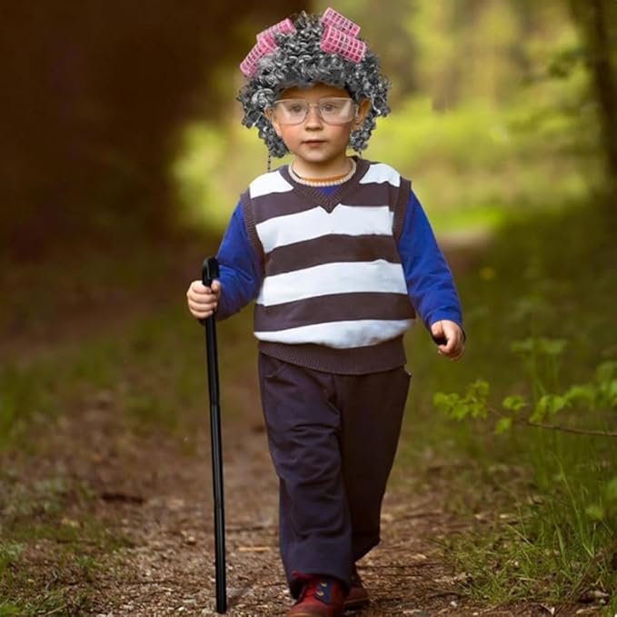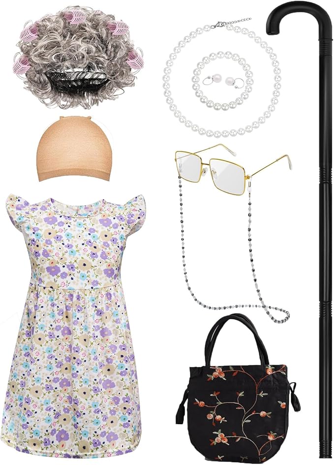 - YouthBro Full Old Lady Costume Pack with 1 x old lady costume dress clothes; 6 x pink HairCurlers; 1 x old lady wig; 1 x black cane; 1 x granny glasses; 1 x grandma costume eyeglass chains strap; 1 x faux pearl beads necklaces; 1 x fake pearl beads earrings; 1x faux pearl beads bracelet; 1 x wig cap; 1x black handbag