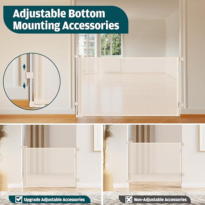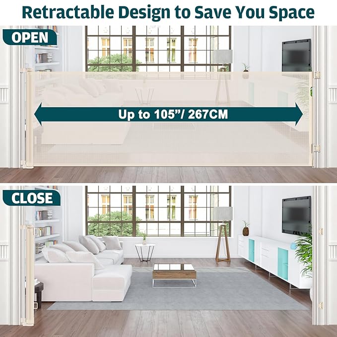 - Retractable Design - The extra wide baby gates for large openings can be adjusted according to your needs to fit your wide openings. When not in use, the mesh can be fully retracted. Compared with traditional metal gate, it has no tripping hazards, saves space and provides wide access.