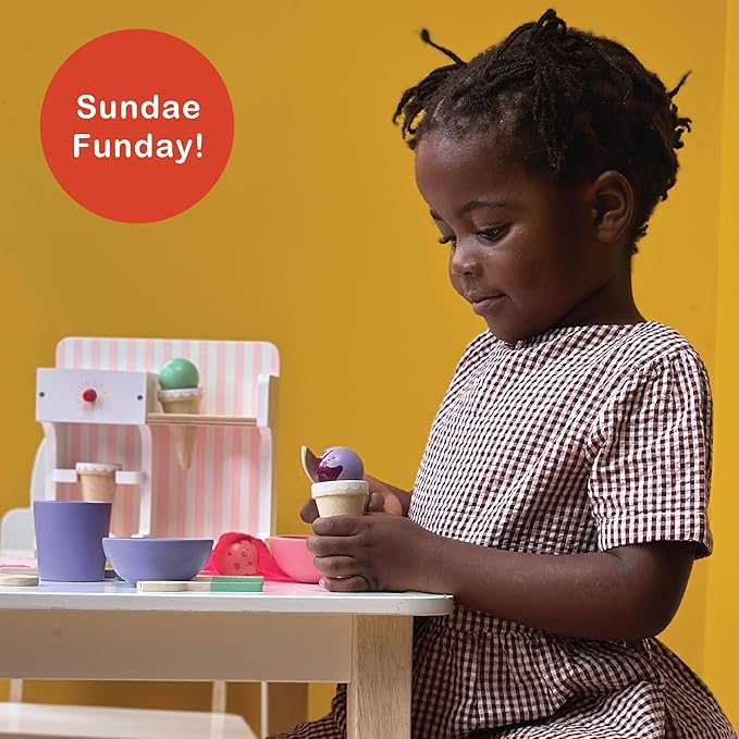 - SWEET PLAYTIME FUN - Step right up to the Ice Cream Kiosk, where little shopkeepers can scoop, stack, and serve up endless fun! This adorable wooden mini-shop comes with three tasty-looking toy cornets and three colorful ice cream scoops - mix, match, and create the sweetest combinations. But wait, there’s a twist! Press the magical red button and watch as the scoop plops perfectly onto the cornet - just like real ice cream (minus the sticky fingers!).