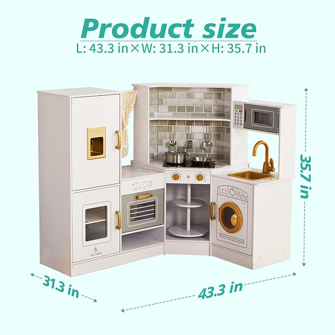 Kids Corner Play Kitchen Set, Wooden Pretend Play Kitchen with Metal Utensils Accessories, Fridge, Sink, Burner, Laundry Playset, Microwave Oven, Cake Turntable, Gifts for Ages 3-8