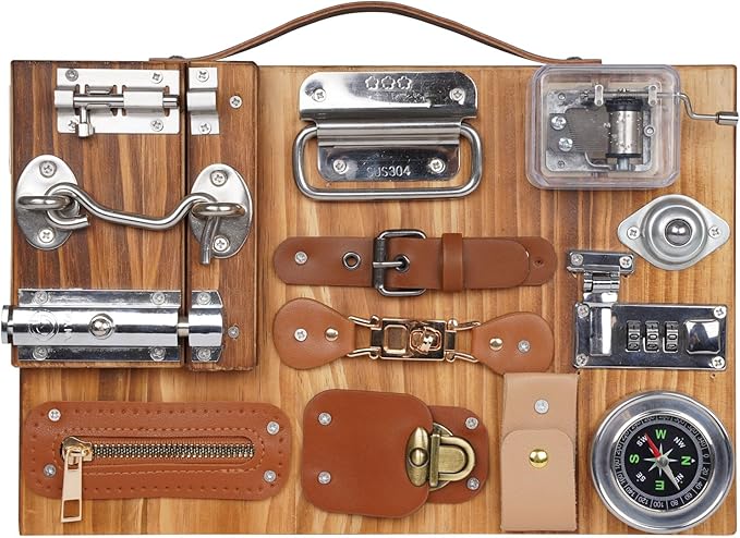 - Montessori-inspired Design: Featuring 12 activities including latches, switches, gears, locks, zippers, and buttons, our Montessori busy board helps children recognize and interact with everyday objects, promoting practical life skills and cognitive development.