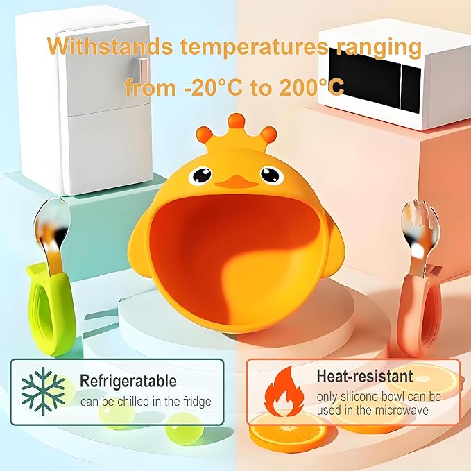Suction Bowls Set for Baby Feeding,Yellow Duck Silicone Suction Baby Bowl and Food-Grade 304 Stainless Steel Bowl with Fork and Spoon,Dishwasher Safe
