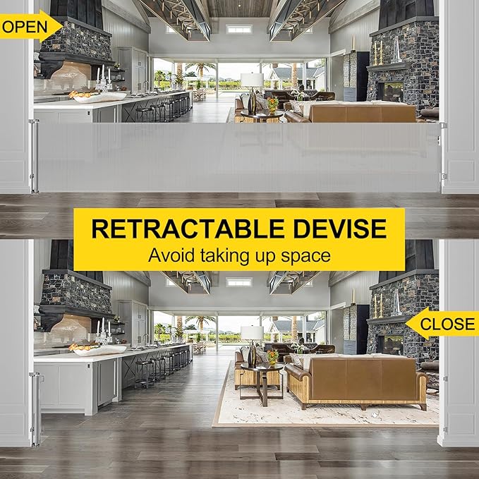 - [Baby Play Area] You can use the extra wide retractable baby gate to separate a safe play area for your baby in your home. Keep your dog out of the baby safety gate and do not disturb your baby.