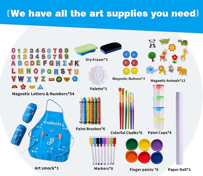 • 【Luxurious art accessories】You will get 2 paper rolls, 6 finger paints, 4 markers, 4 paint pots, 6 round magnetic buttons, 1 set of magnetic letters and numbers, 1 dry eraser, 5 paint brushes, 1 palette board, 1 art smock and 12 colored chalks. Art has no age limit. Embark on an artistic journey with your children.