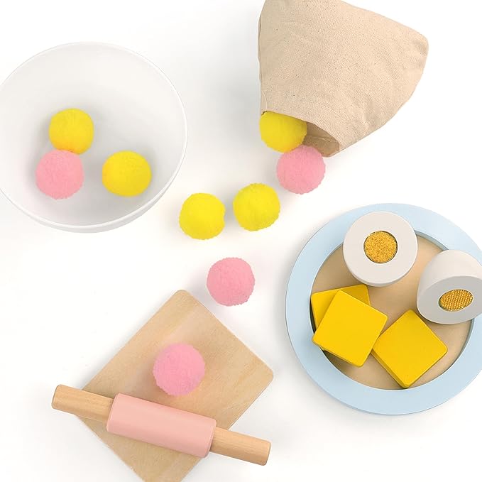 - Pretend Play Set: Complete with a wooden toy mixer, plastic bowl, wooden plate, and cuttable wooden egg and butter, play kitchen accessories sparks interactive fun. Kids can mix, pour, and serve their culinary creations, promoting hands-on learning and coordination
