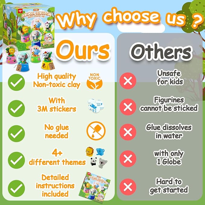 - 🐨ENTERTAINING & EDUCATIONAL | Engage your children in hours of creative play with our DIY snow globe kit. Watch as they mold their figurines and create their magical glittering water globes. Also, this Kids Art & Craft kit can act as a wonderful terrarium kit for kids, and create story-telling family time.