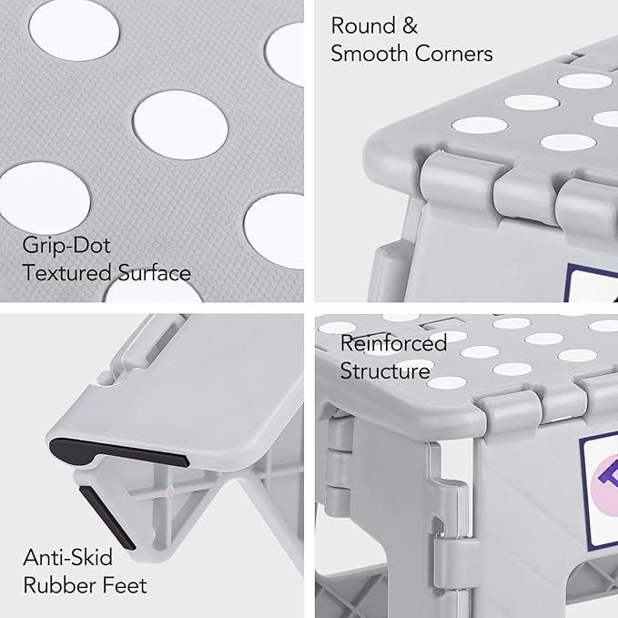 - Collapsible One-Step Stool : The grip-dot textured surface, anti-skid rubber feet design, and smooth rounded edges of this collapsible step stool makes it extra safe for children to use as they are protected from possible bruises that can result from sharp edges. It comes with a handle making it easy to carry around at home or outdoors when needed