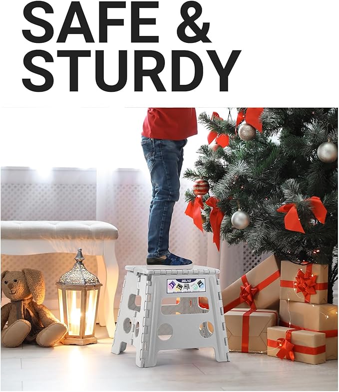 - Strong, Sturdy & Portable Stool : Our foldable, portable and easy-to-store step stool is CPC Certified. A sturdy and solid design with tight hinges makes it extra strong and safe. The folding bar adds support and prevents our non-slip step stool from collapsing when you put weight on it. For optimum safety, this stool for kids and adults must be fully opened before use