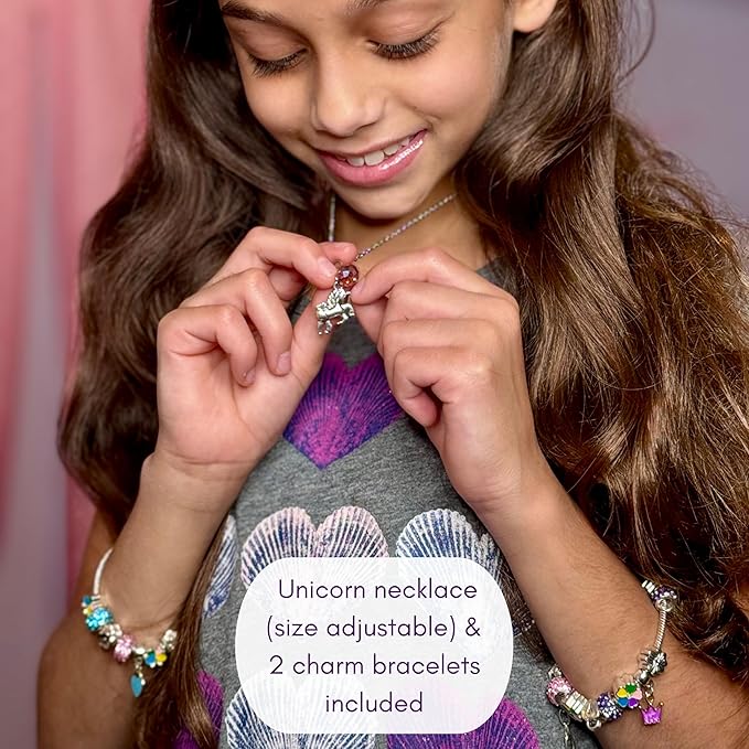- THREE PIECE JEWELRY SET INCLUDED - The only jewelry box with two sparkly charm bracelets plus a matching unicorn necklace. Be creative and change the necklace and bracelet bead combinations by removing and re-threading the beads.