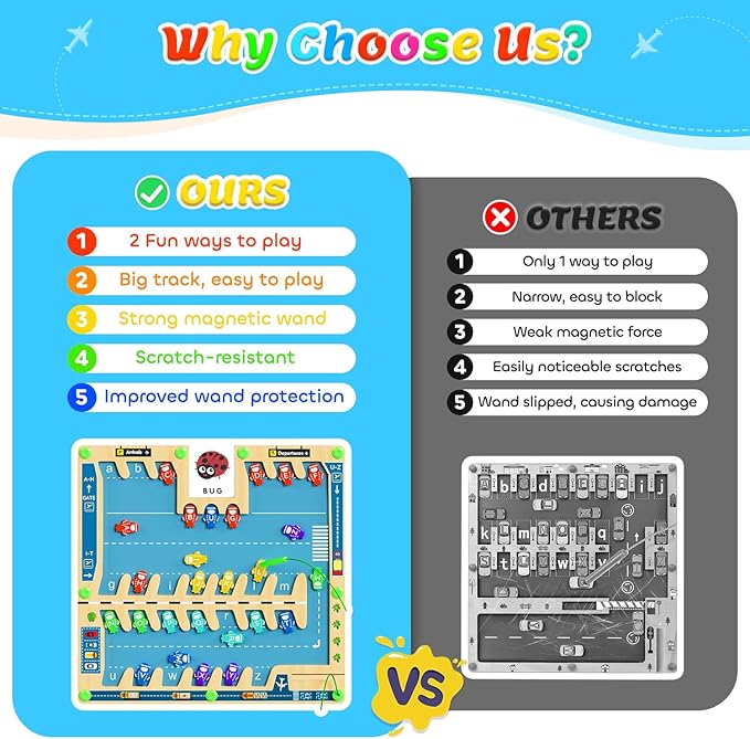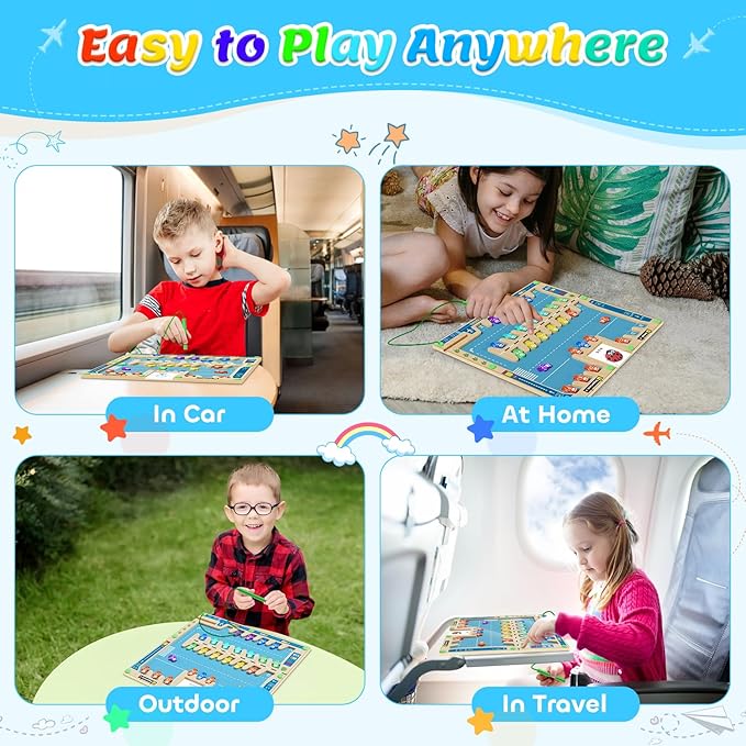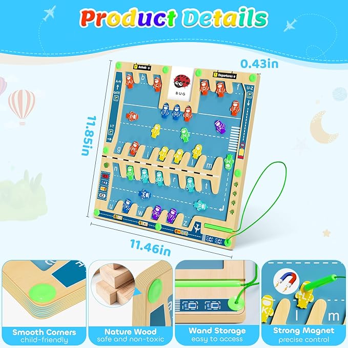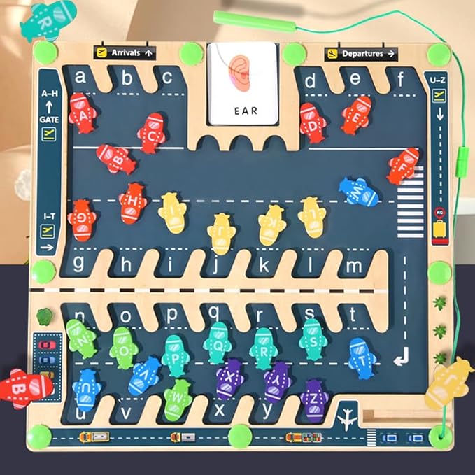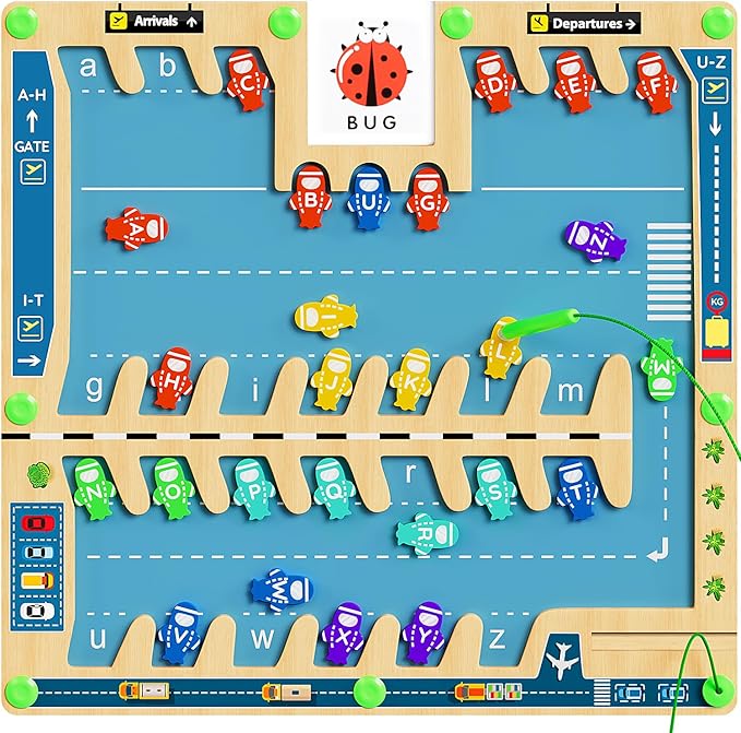 - [Educational Magnetic Toys]: Magnetic alphabet maze is a fun and engaging way for children to learn letters! Children can use a magnetic pen to navigate magnetic airplane letters through paths and obstacles to "parking spaces" with corresponding letters to challenge problem-solving and develop spatial awareness. They can also exercise hand-eye coordination, letter recognition, color recognition, word spelling skills, and keep them entertained for hours