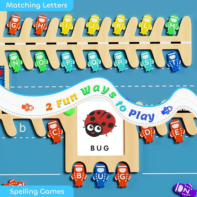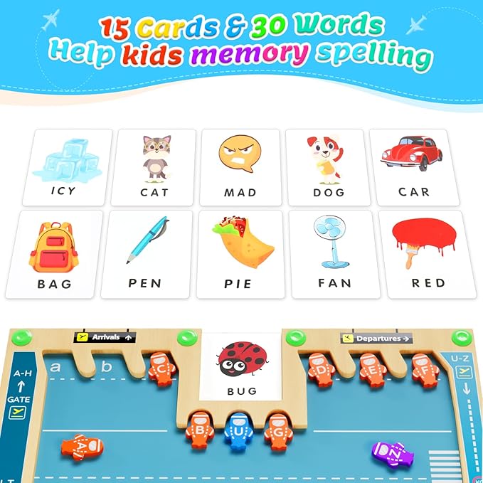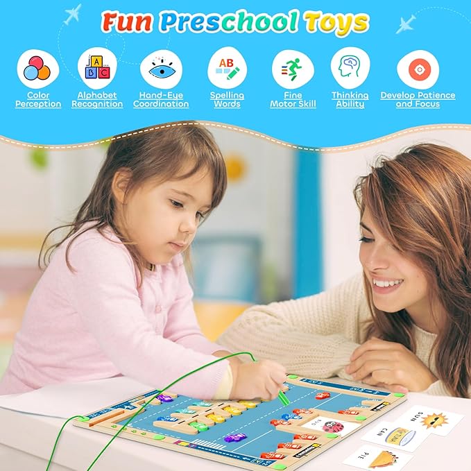 - [Engaging Learning Toys]: The montessori magnetic maze is ideal for group play and parent-child interaction, helping to enhance friendship and parent-child relationships. Comes with 15 word cards, printed on both sides, with a total of 30 words to help children identify words and simple things by playing games. Children can practice their spelling skills by using a magnetic pen to move the plane from the track to the parking lot. The wand comes with its own thread, is not easy to lose, and can be stored inside the magnetic alphabet maze letter puzzle
